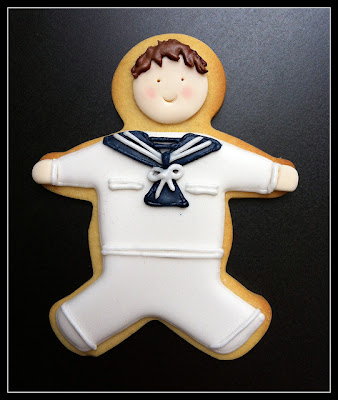 Esta galleta es el prototipo que he hecho para la comunión de Alex, el hijo de una amiga. Llevará su traje de marinero raso. Un traje que me encanta por lo sencillo que es y por la combinación de colores. Alex va a estar guapísimo!!!! y dará a sus invitados un recuerdo especial de ese día: un mini Alex con la réplica de su traje :)